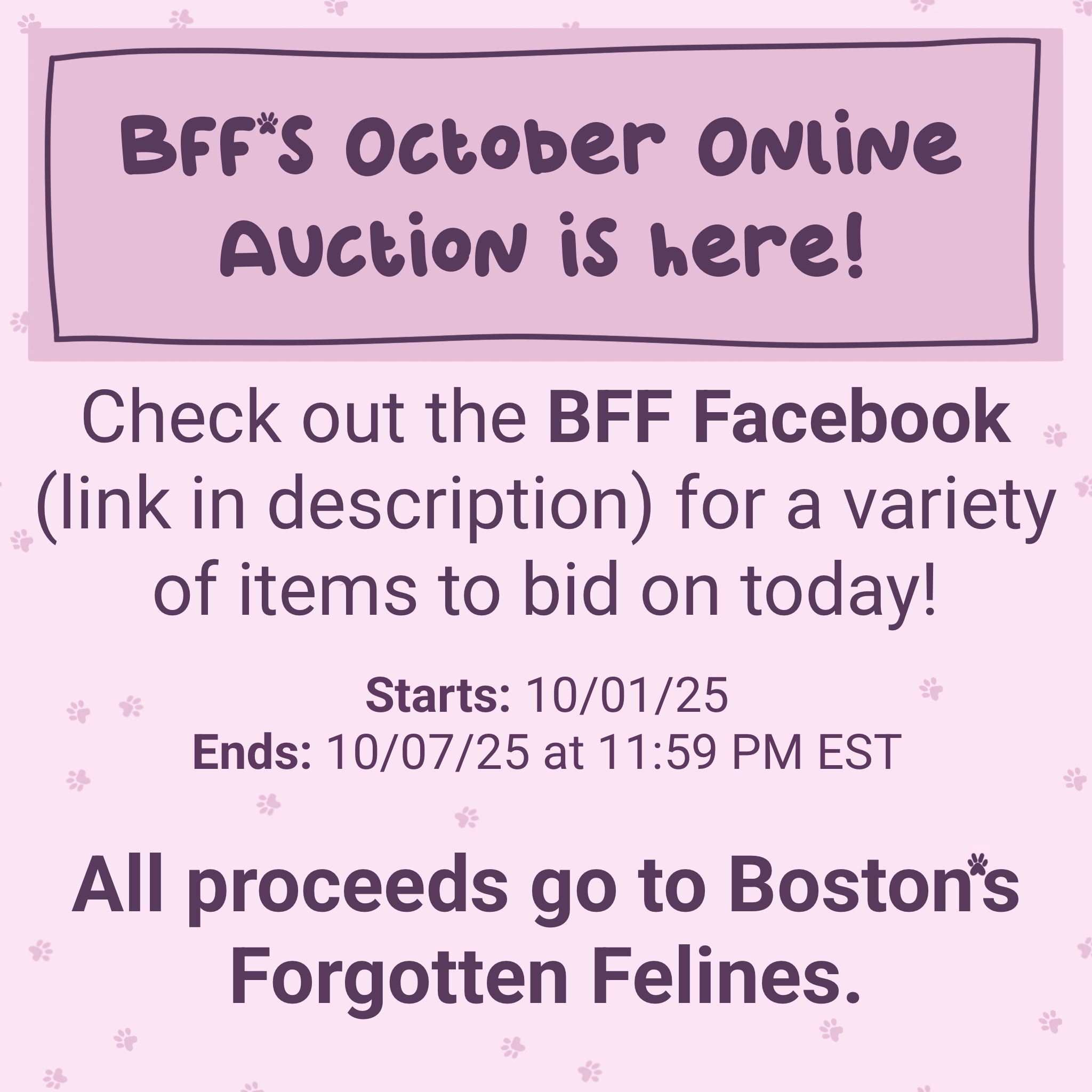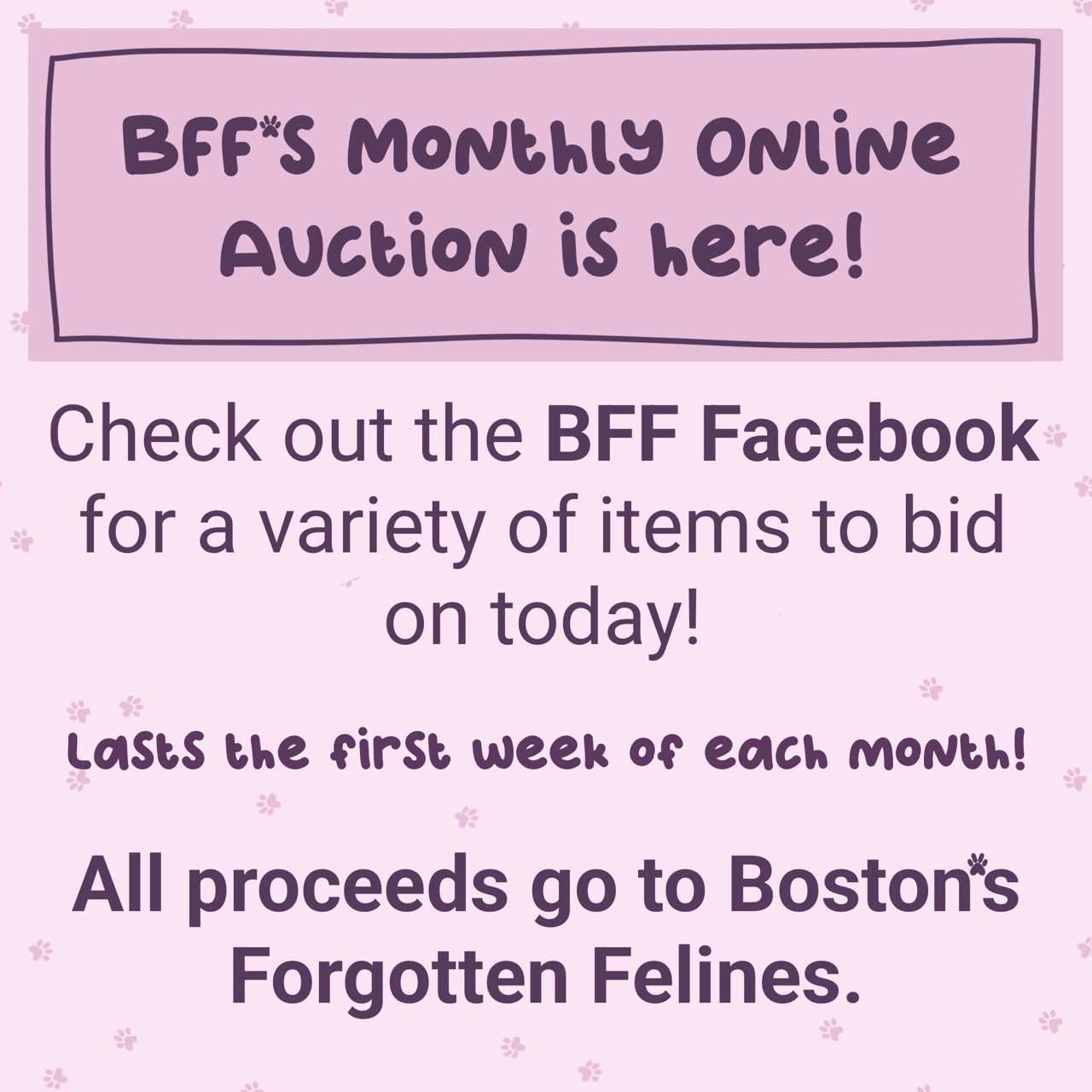 A variety of items to bid on. All donated with proceeds to benefit Boston’s Forgotten Felines. For the item you’re interested in please comment with your bid under the picture of the donated item on Facebook. To help keep the auction manageable, if you can limit comments to bids only, it will be greatly appreciated.